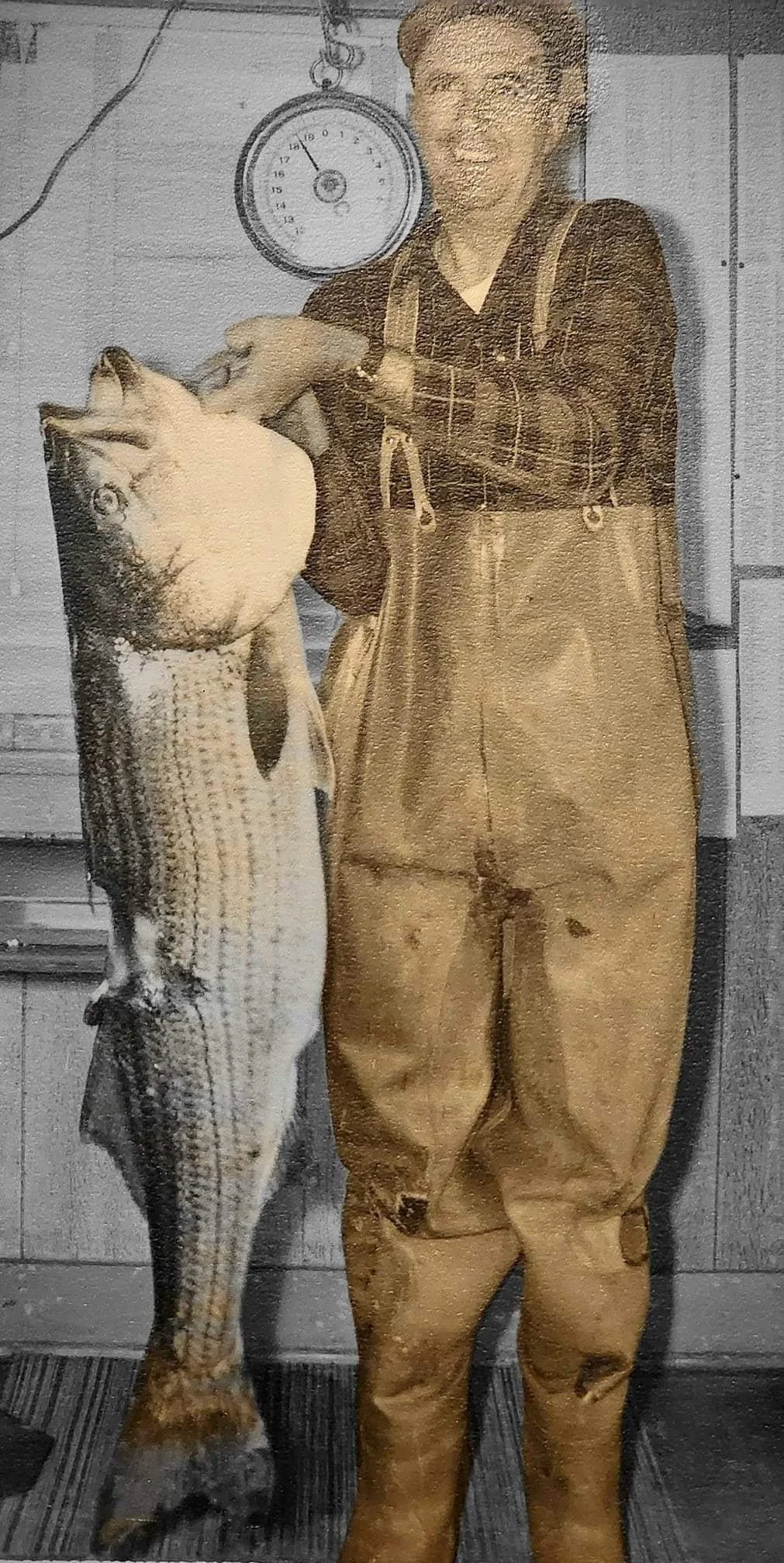 On November 21, 1963 William Littman caught a 45” 38lb 15oz striped bass on bloodworm fishing the Ship Bottom surf. It was the 3rd place fish in the LBI Striped Bass Derby, 8th place in the Asbury Park Press Individual Competition and the first place largest fish caught in the Long Beach Island Fishing Club contest. Weigh in photo is shown on the right.