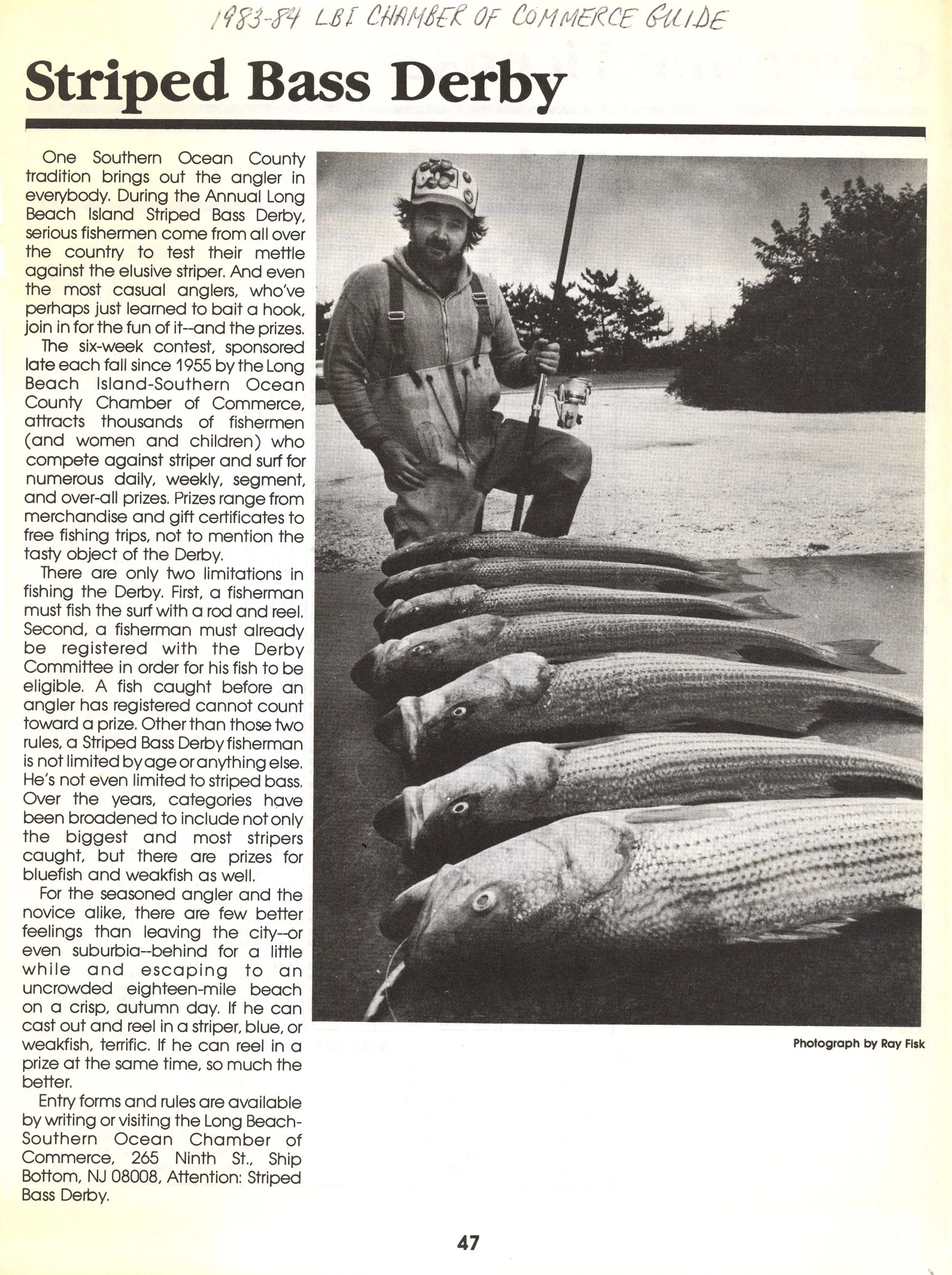 The Long Beach Island Surf Fishing Tournament began in 1955 as the “Striped Bass Derby”. Back then the Southern Ocean County Chamber of Commerce was the LBI Board of Trade. Building lots in Loveladies could be had for $2250 and Long Beach Township was home to 1000 year round residents. In 1956, the registration fee for the Derby was $3.