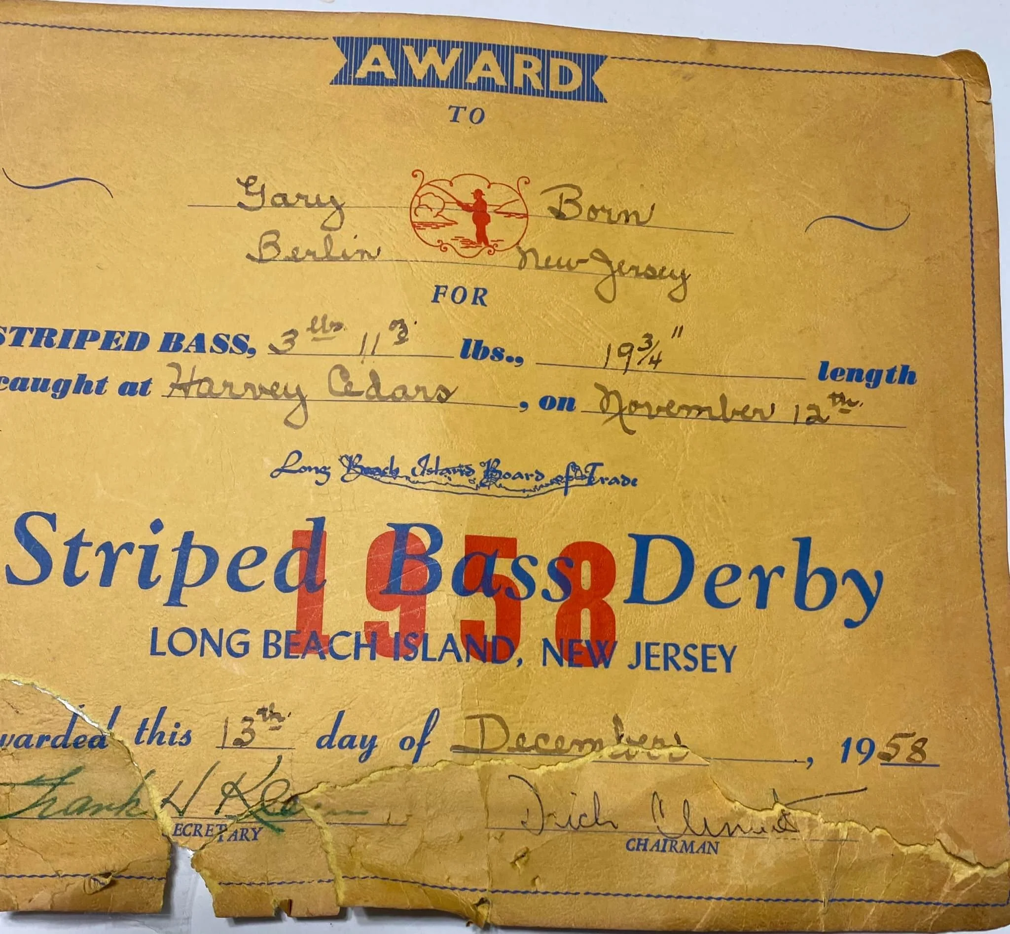 The 1958 Striped Bass Derby Award is an awesome piece of Derby history from the 4th annual tournament - The weight slip from then 12 year old Gary Born for a 19” Striper he weighed in. Gary remembers how excited his parents were for the catch and weigh in and that he won a bicycle!